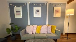 落ち着いた木目調のオシャレな店舗。ソファやスツールの他にパイプ椅子2脚をご用意しています。