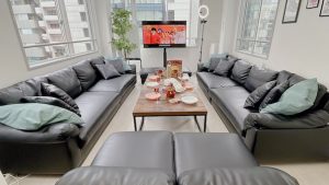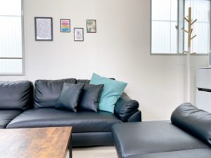 白を基調としたオシャレな店舗に大型のソファを両サイドに配置しています。